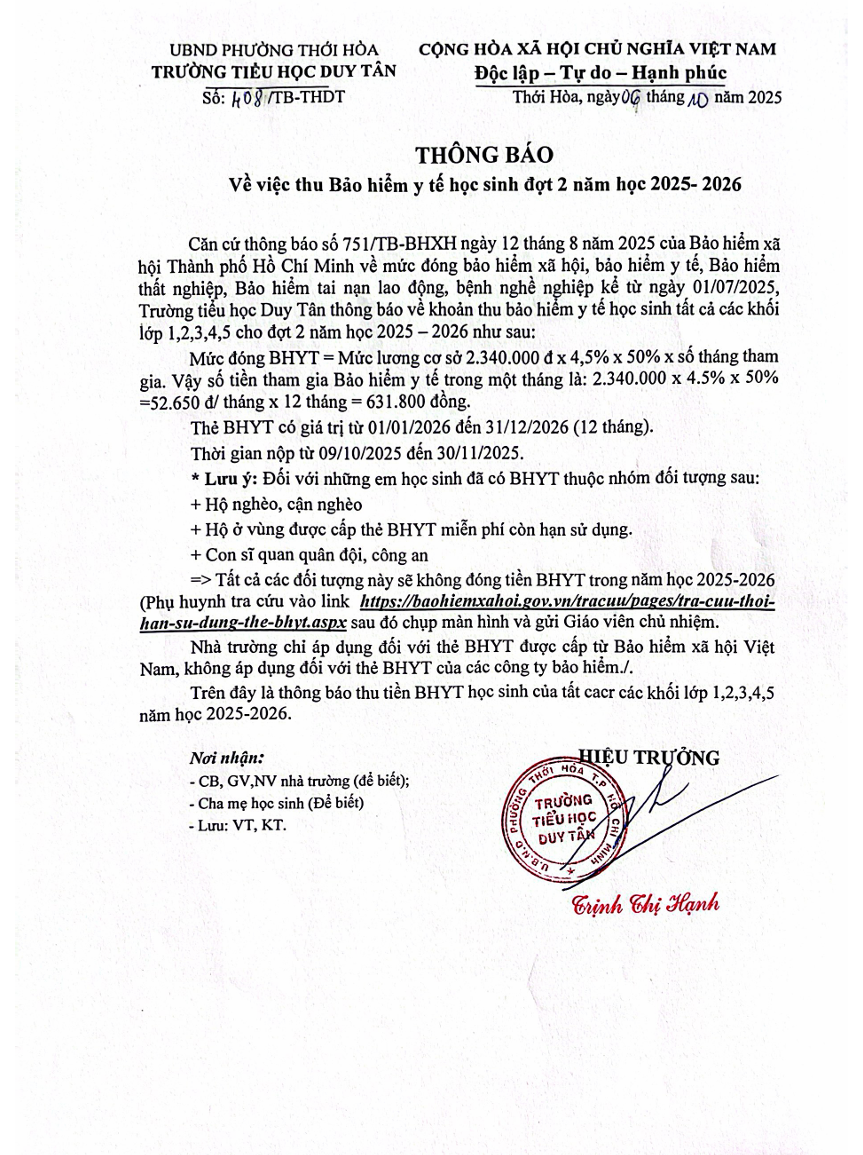 Trường Th Duy Tân thông báo thu Bảo hiểm y tế học sinh đợt 2 năm học 2025 - 2026