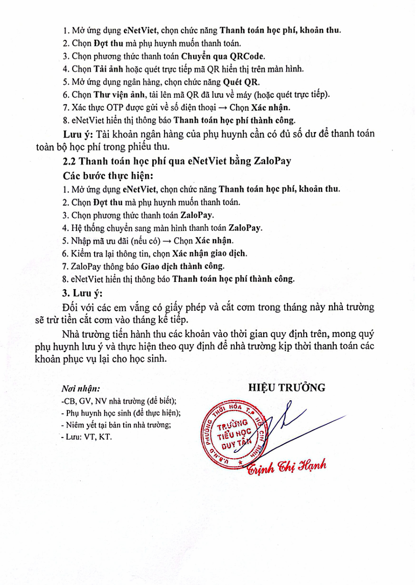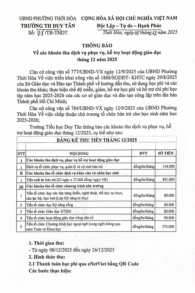 Thông báo về các khoản thu dịch vụ phục vụ, hỗ trợ hoạt động giáo dục tháng 12/2025