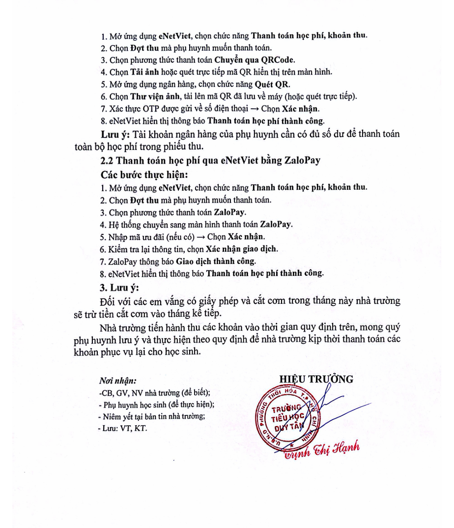 THÔNG BÁO VỀ CÁC KHOẢN THU PHỤC VỤ, HỖ TRỢ HOẠT ĐỘNG THÁNG 10/2025