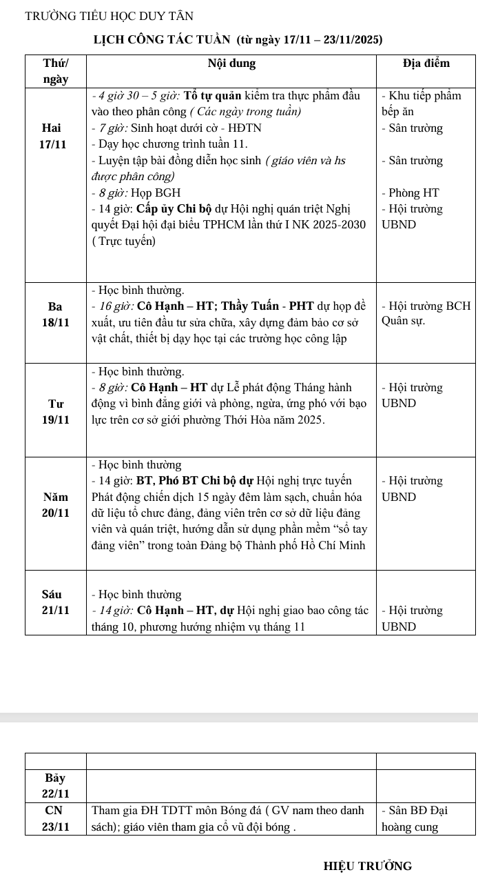 LỊCH CÔNG TÁC TUẦN 11 TỪ 17 - 23/11/2025