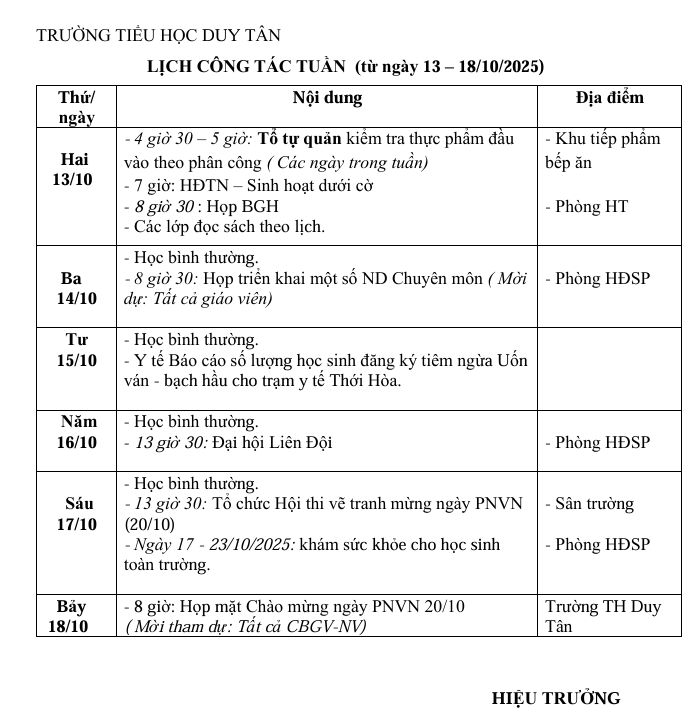 LỊCH CÔNG TÁC TUẦN 6 TỪ 13 - 18/10/2025