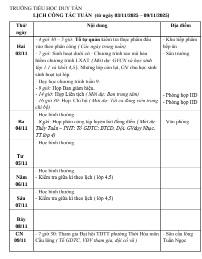 LỊCH CÔNG TÁC TUẦN 9 TỪ 03 - 09/11